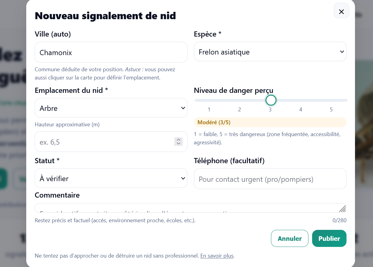 SignalNids est une plateforme citoyenne et ouverte qui permet de déclarer et cartographier les nids (frelons, guêpes…) en quelques secondes. L’objectif : informer le public local, faciliter la vérification communautaire et aider les collectivités / apiculteurs à prioriser les interventions.